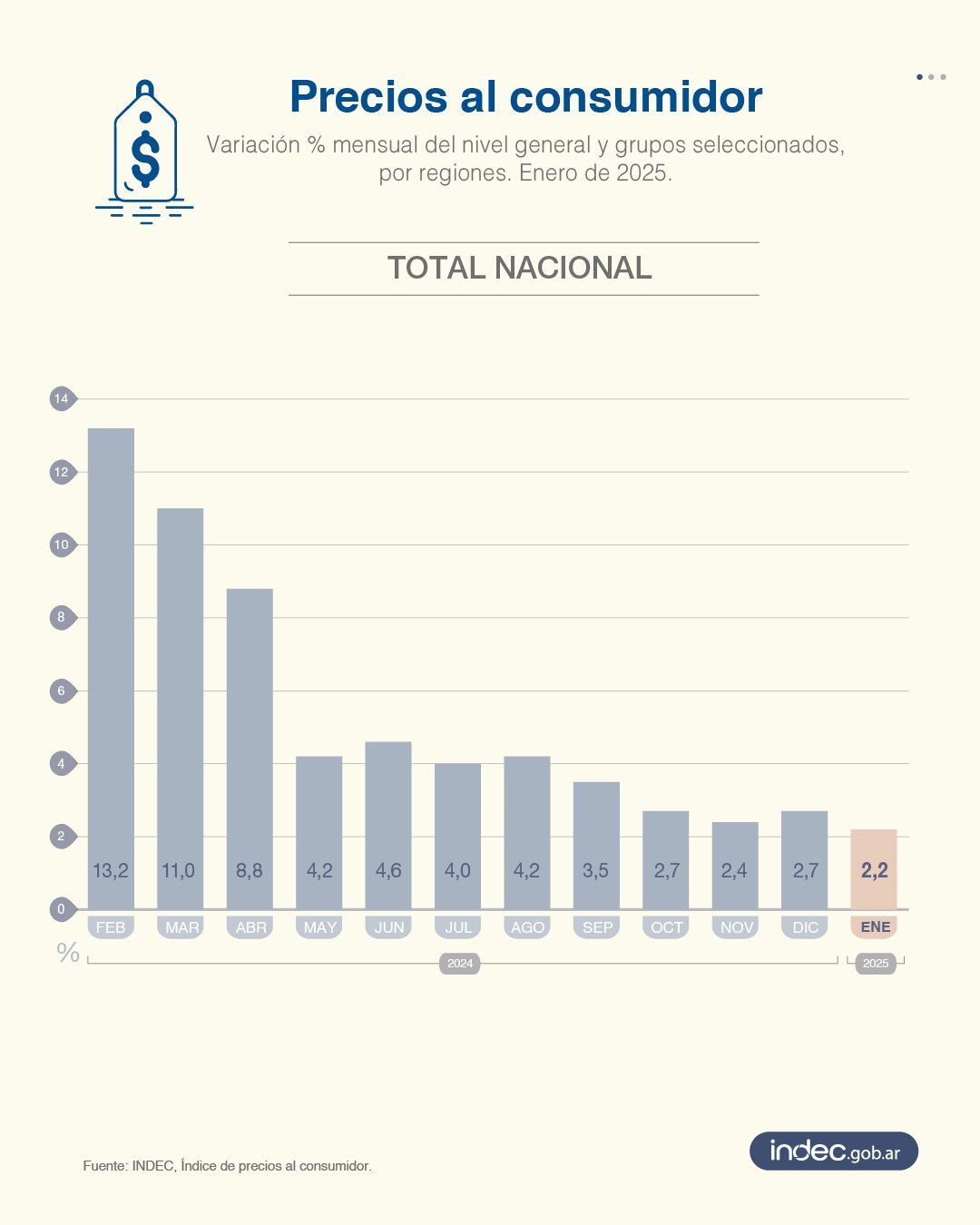 El INDEC confirmó que la inflación de enero fue del 2,2%, marcando el registro mensual más bajo desde julio de 2020. Este dato refuerza la tendencia de desaceleración de precios que el Gobierno busca consolidar.