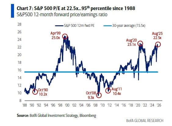 Según Bank of America, el índice S&P 500 cotiza a 22,5 veces las ganancias estimadas a 12 meses (forward P/E), su nivel más alto desde agosto de 2020 y muy cerca del pico de la burbuja puntocom (25x en 1999).