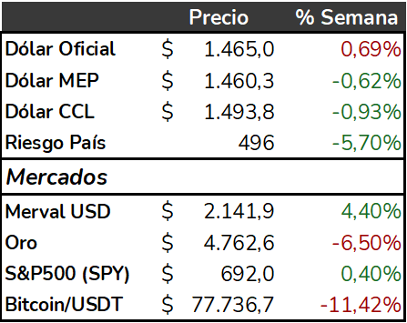 En un contexto global adverso, Argentina mostró un desempeño relativo mejor. Las acciones locales en dólares cerraron una muy buena semana, los ADRs resistieron la volatilidad y, aunque los bonos soberanos tuvieron leves bajas diarias, el balance semanal fue positivo. Esto permitió que el riesgo país vuelva a ubicarse por debajo de los 500 puntos, señal de compresión de spreads.