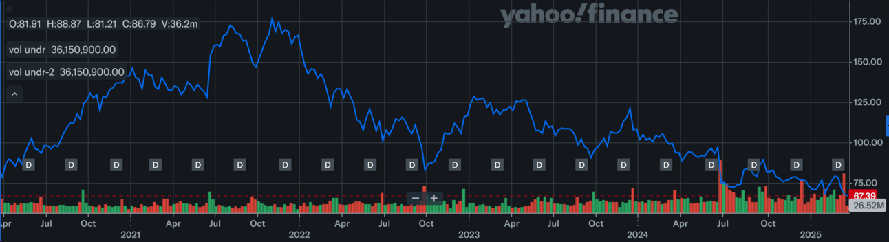La acción de Nike (NKE) cayó un 62% desde su máximo de 2021 y tocó su mínimo en cinco años. Es su peor baja en dos décadas.