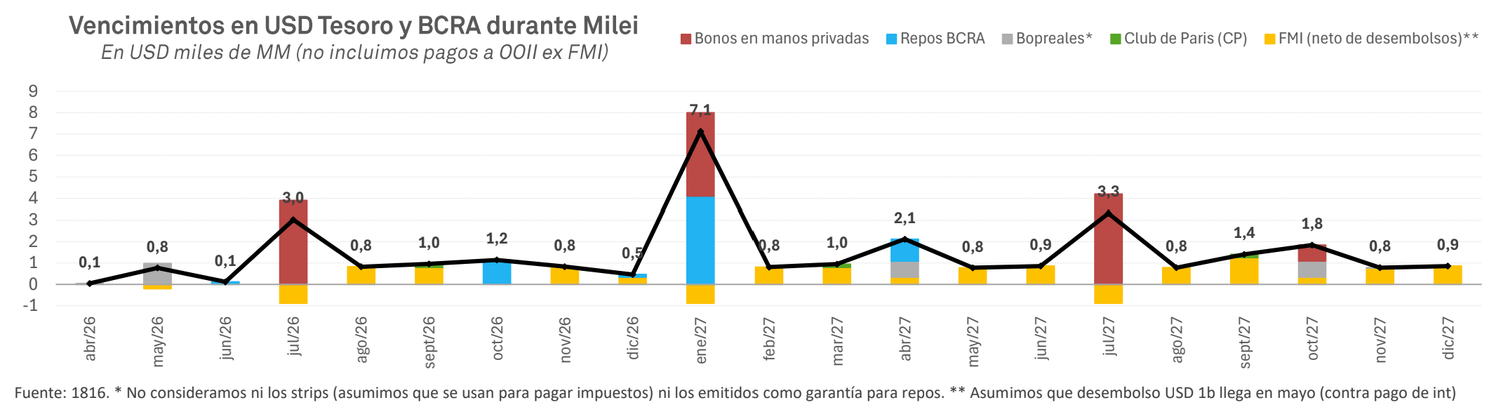 Los vencimientos en moneda extranjera hasta 2027 rondan los USD 30.000 millones, de los cuales aproximadamente USD 23.800 millones impactarán directamente sobre las reservas. Esto implica una necesidad de financiamiento cercana a los USD 26.500 millones en los próximos dos años.