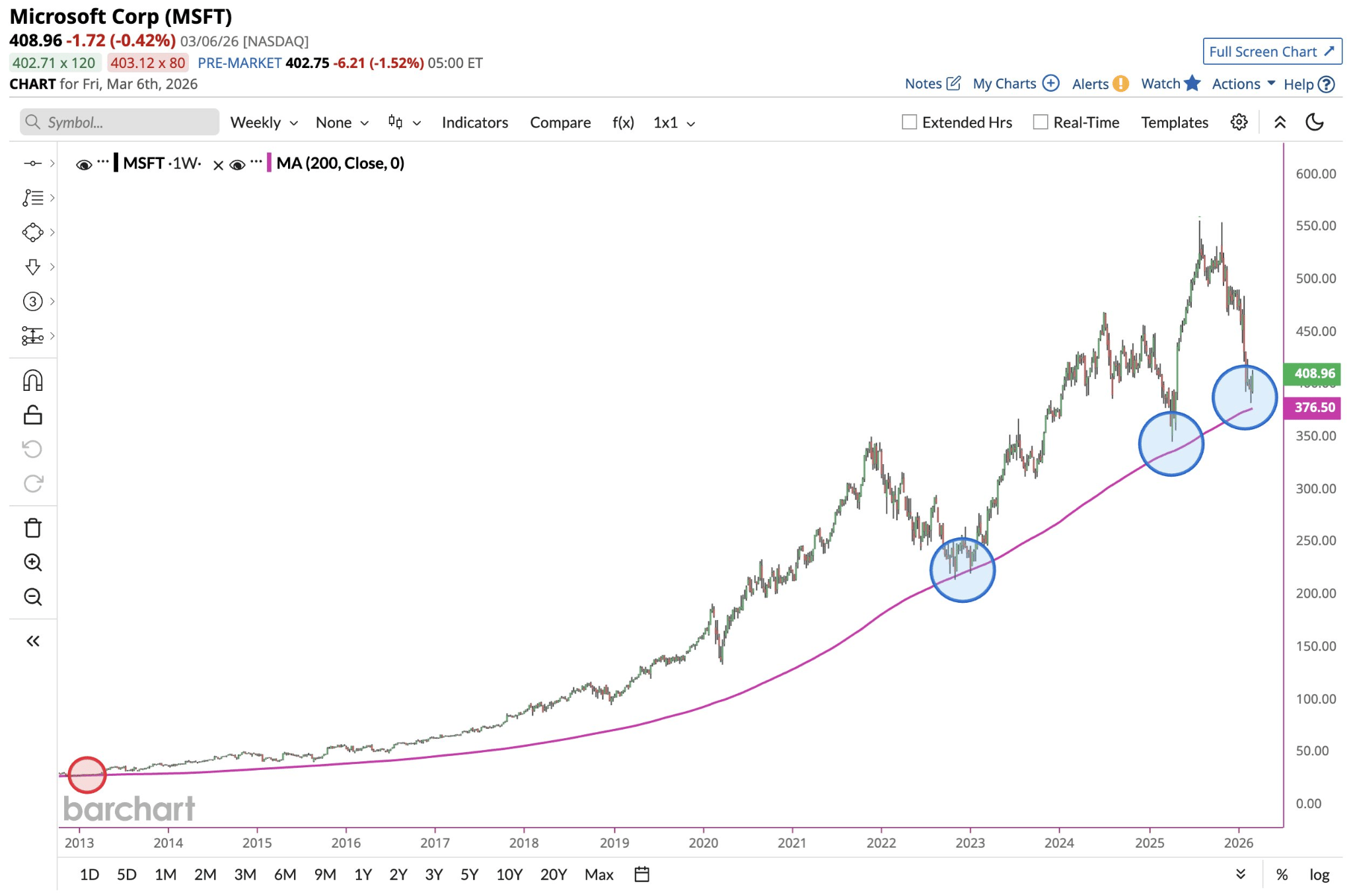 Un dato técnico relevante es que la acción no ha cerrado por debajo de su media móvil de 200 semanas en más de 12 años. Este nivel ha funcionado como soporte en múltiples episodios de corrección del mercado, incluyendo el bear market de 2022 y distintos episodios de volatilidad en los últimos años.