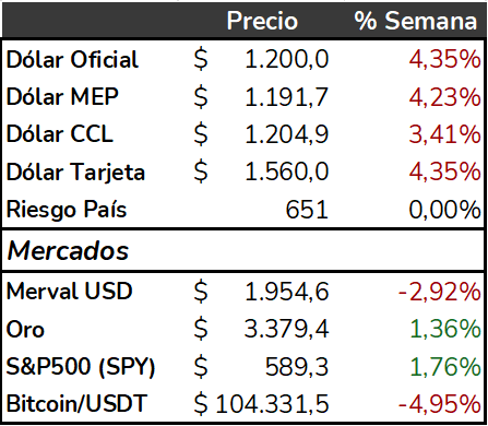 📉 El riesgo país cerró en 651 puntos básicos, igual que la semana pasada.